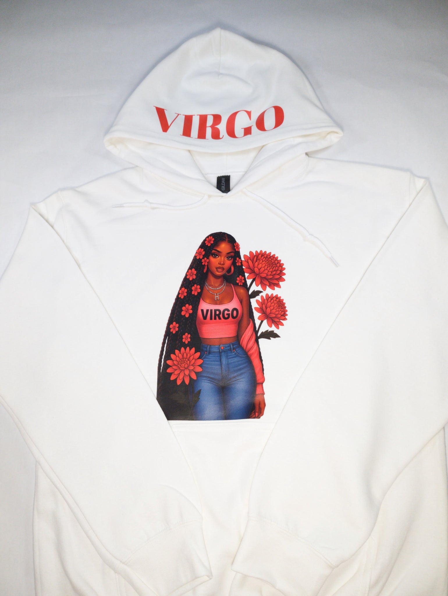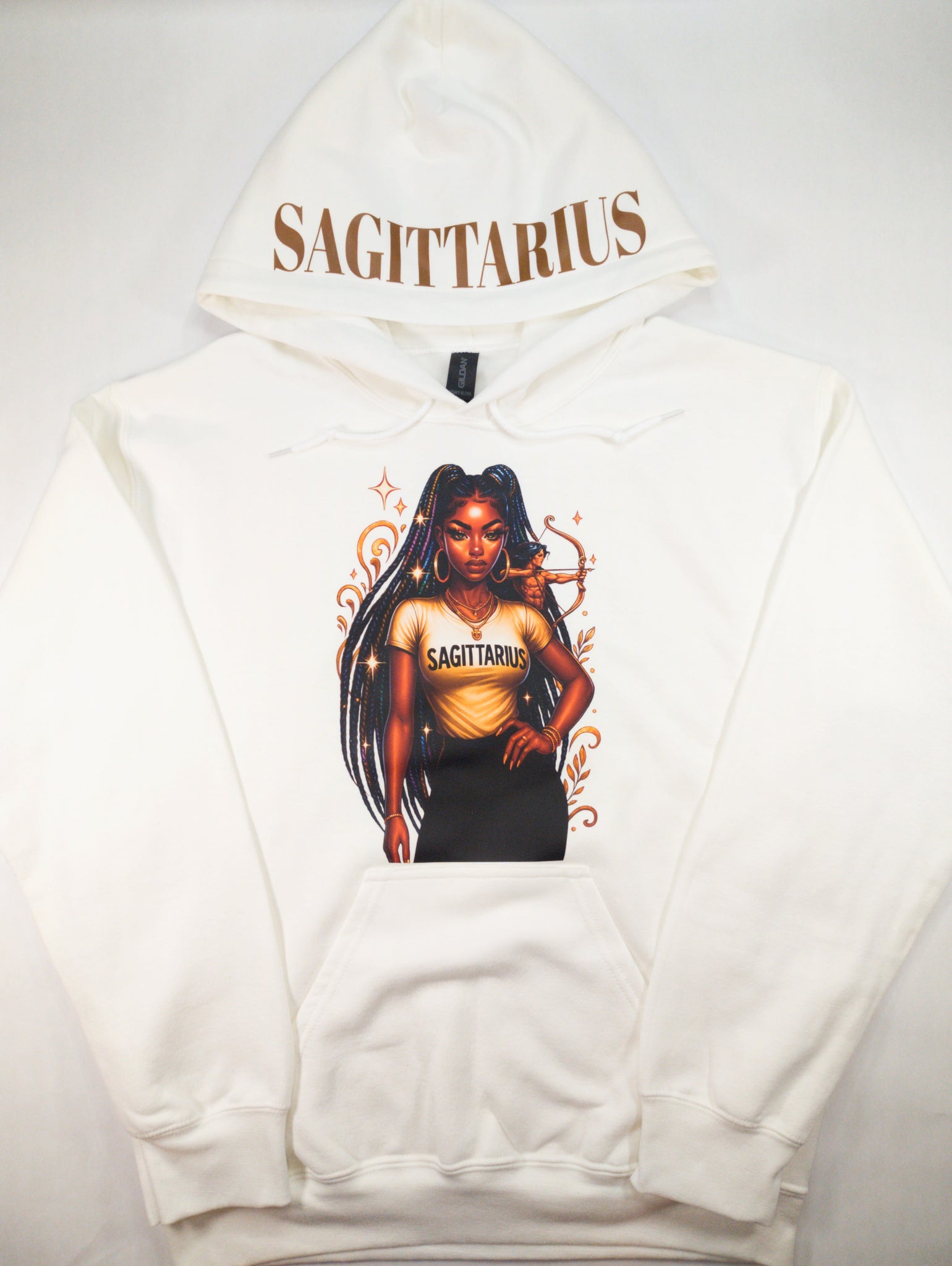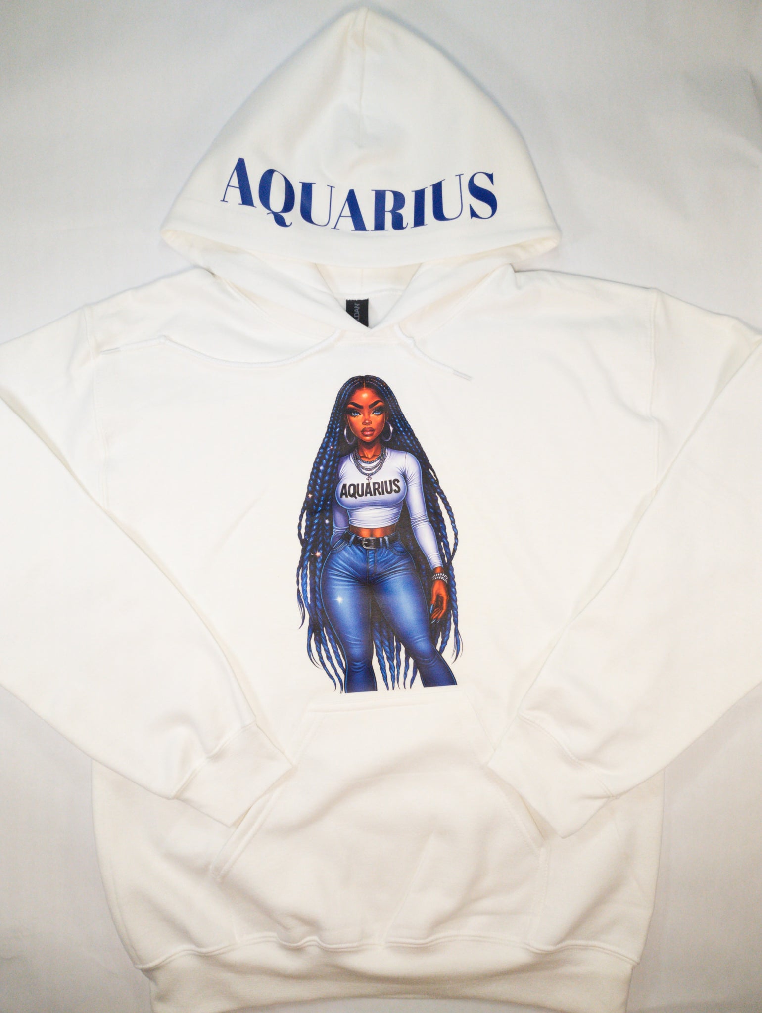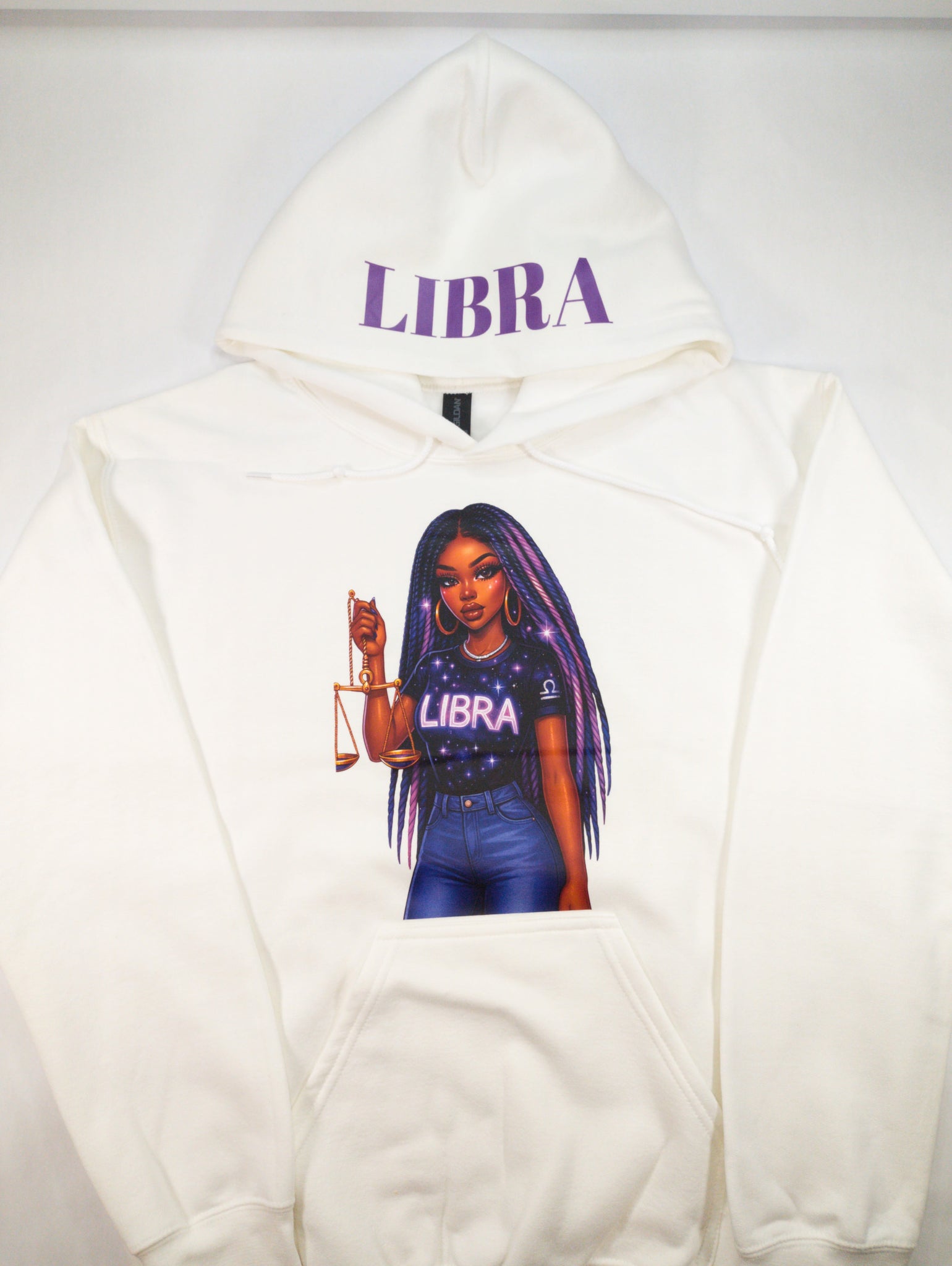 Embrace your astrological power with our Zodiac Girl Hoodie, a celebration of Black girl magic and cosmic energy. Each hoodie showcases a beautiful illustration of your zodiac girl on the front of a white canvas, with your sign's name proudly displayed across the hood. Designed with practicality in mind, the front pocket adds everyday functionality to this statement piece. Wear your sign with confidence and style, knowing you're representing the unique strength and brilliance of your celestial identity.