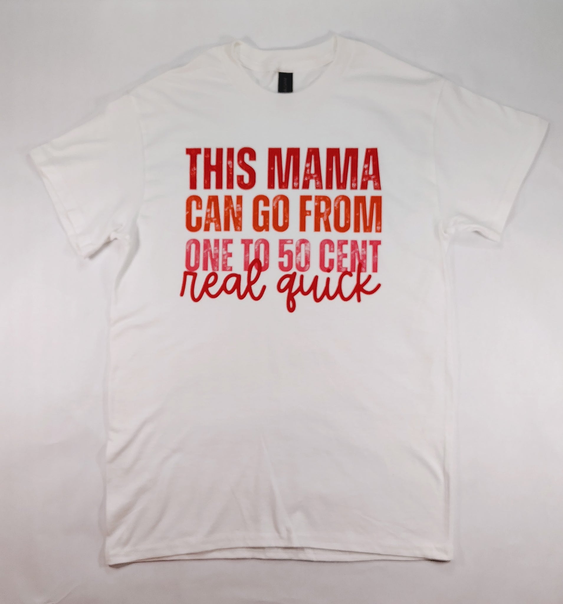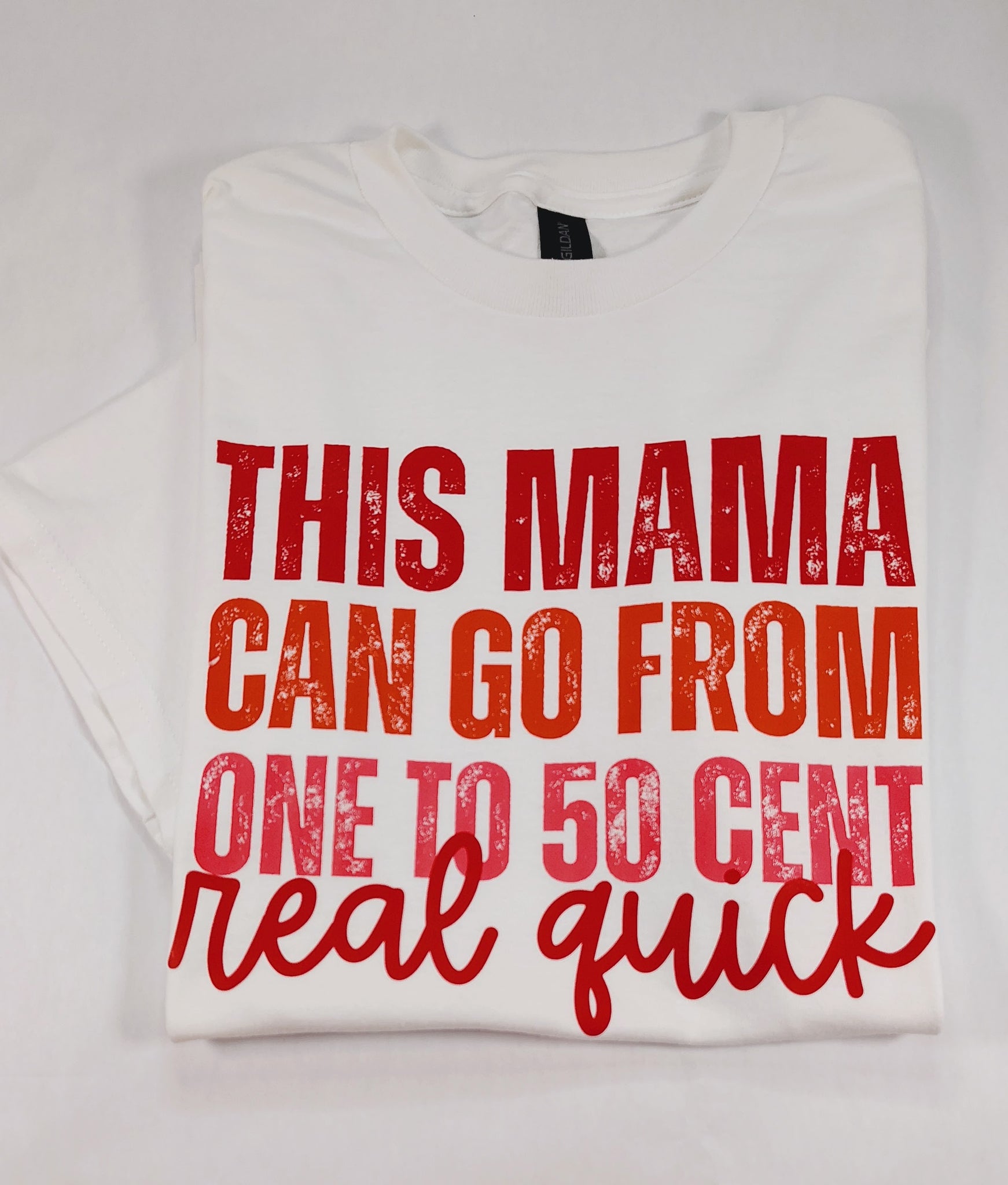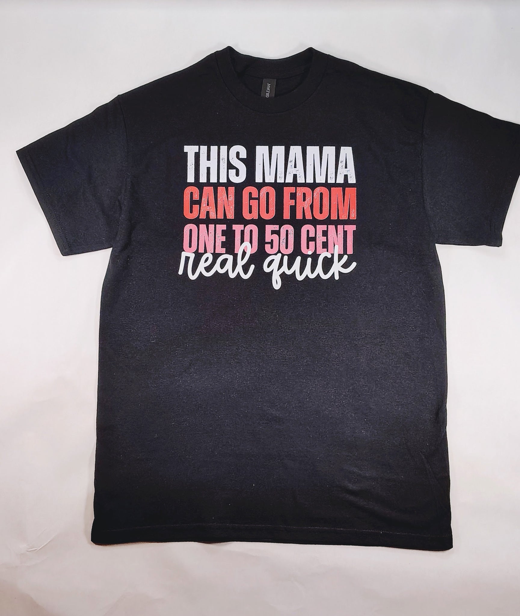 This Mama Can Go From One to 50 Cent T-Shirt, Rock your confidence with this bold graphic tee designed for moms who know how to handle anything. Featuring eye-catching lettering in vibrant pink, red, and white, this playful design celebrates the strength and quick wit of modern motherhood. Available in classic white or black, it's the perfect way to express your personality while keeping it real. Comfortable, versatile, and unapologetically fun—because every mama deserves to feel empowered in what she wears.
