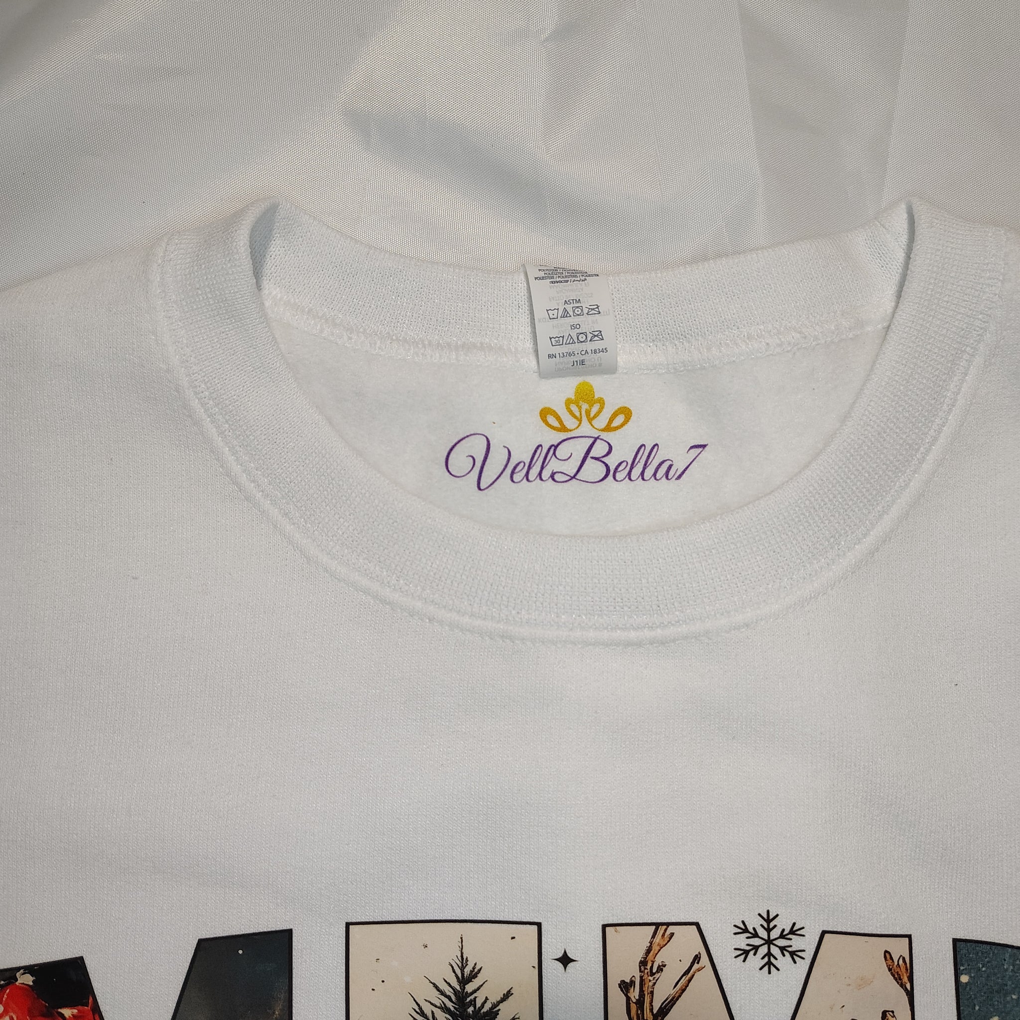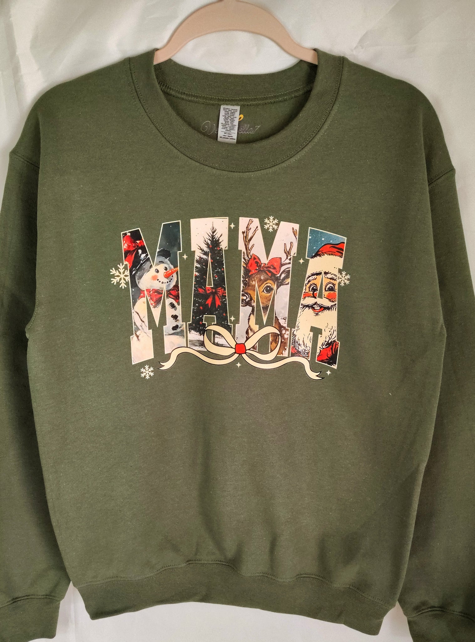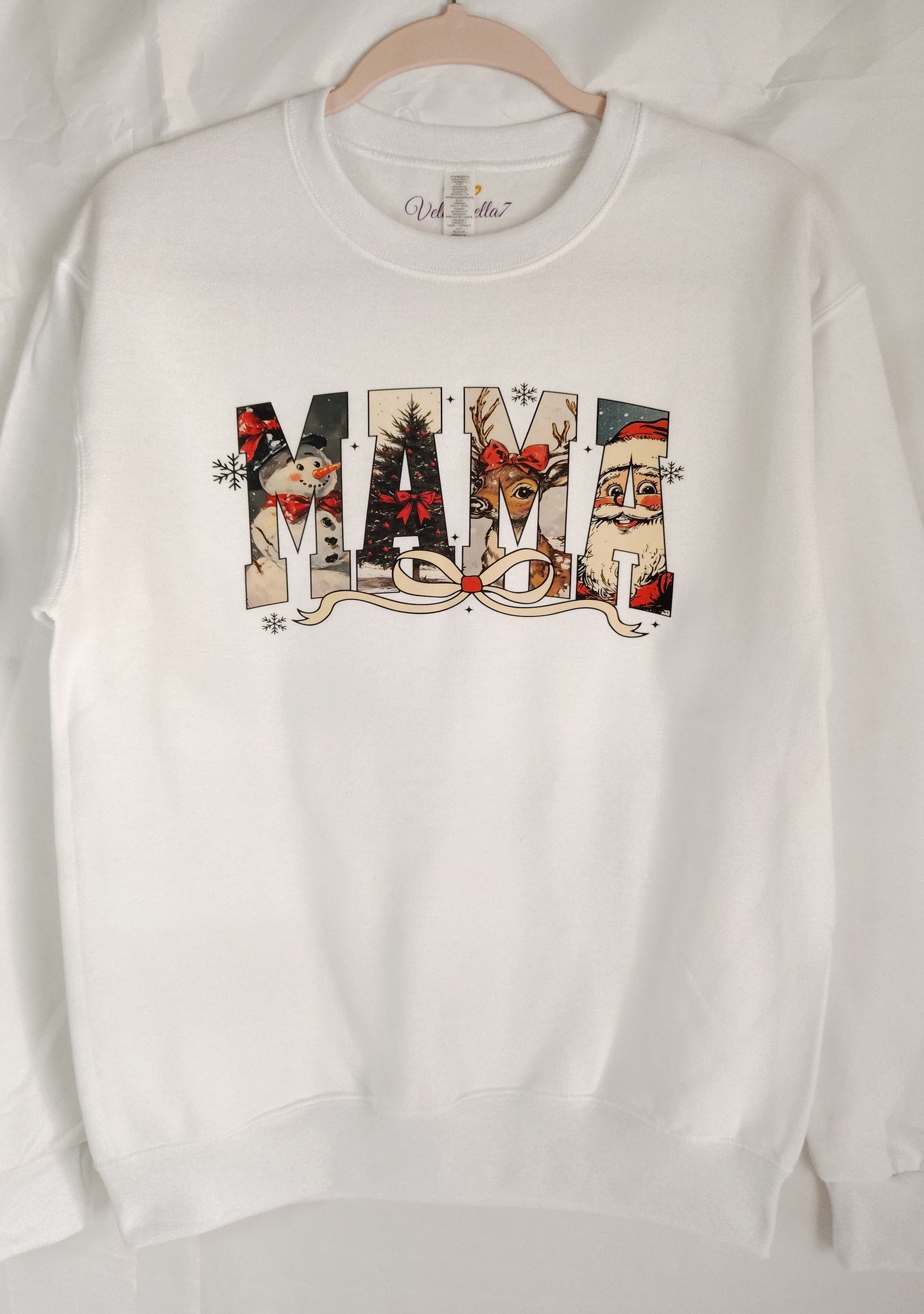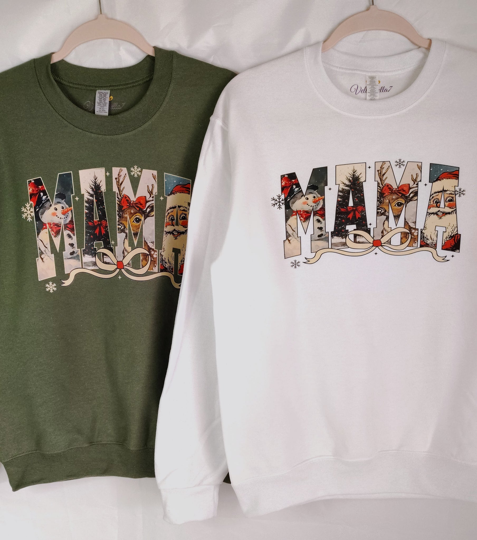Celebrate the season in style with this charming Mama Christmas Sweater. Available in crisp white or rich forest green, this cozy knit features the word "MAMA" adorned with festive holiday graphics—a cheerful snowman, twinkling Christmas tree, jolly reindeer, and Santa Claus cleverly integrated into each letter. Perfect for holiday gatherings, family photos, or everyday winter wear, this sweater lets you show off your festive spirit while embracing your role as the heart of the celebration. Soft, comfortable, and undeniably merry.