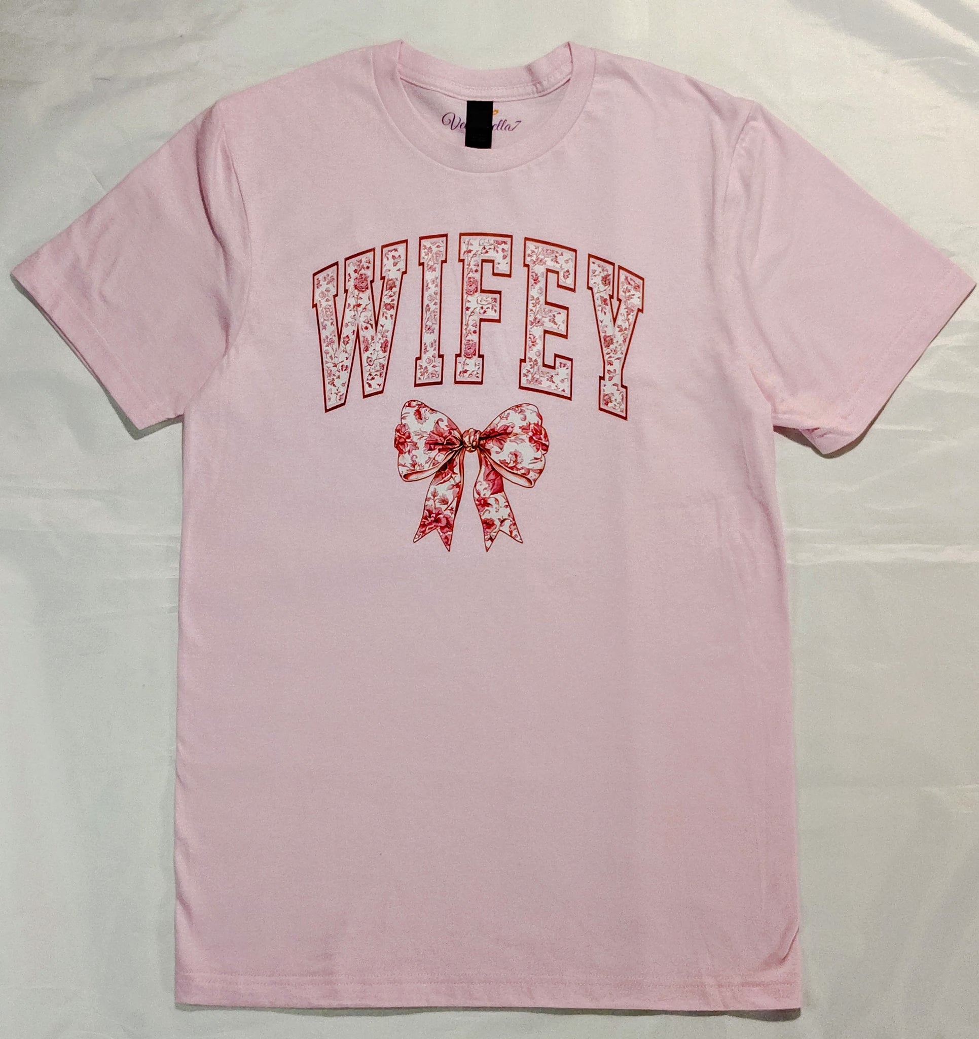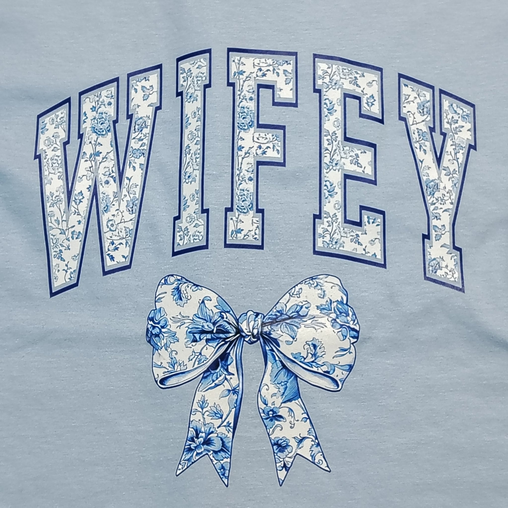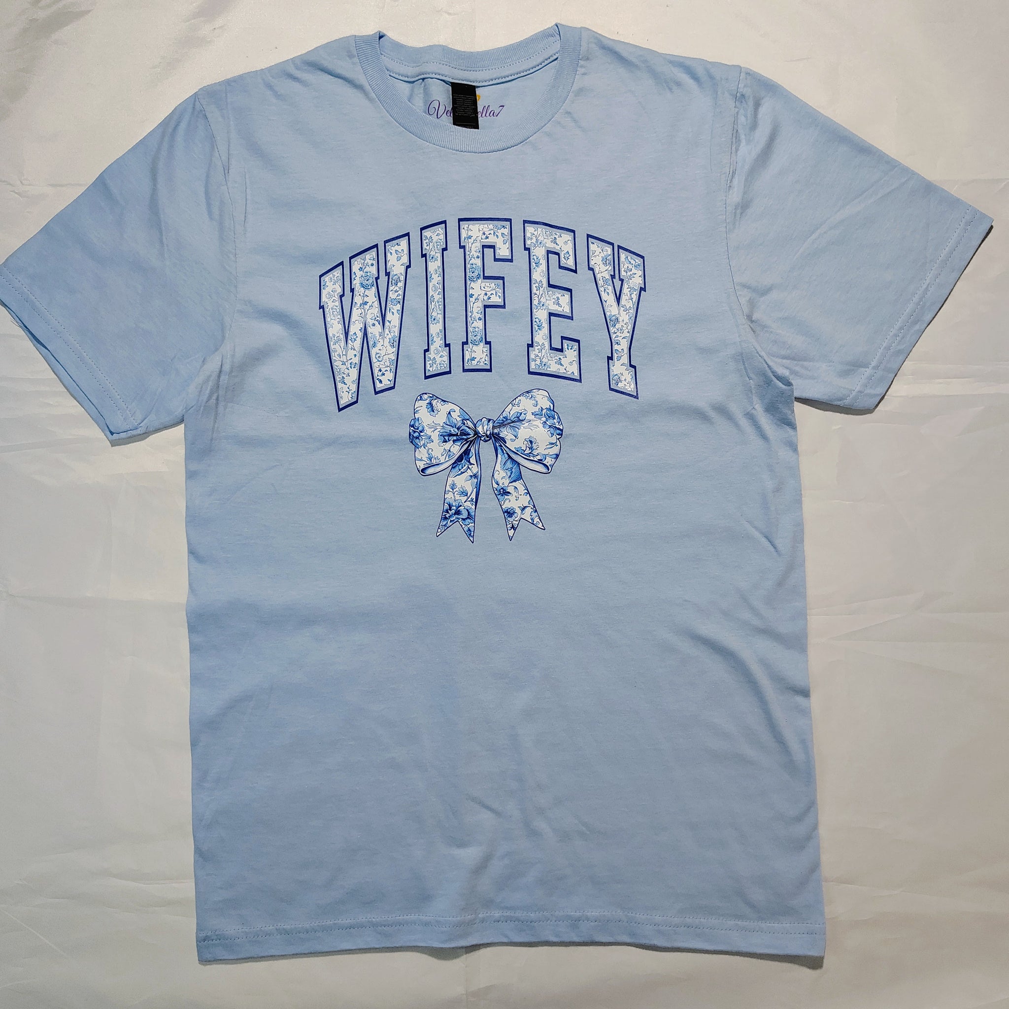Celebrate your special role with this charming Wifey tee featuring delicate floral lettering and a sweet bow accent. Available in soft blue or pink, this lightweight shirt is perfect for everyday wear—comfortable enough for casual outings yet stylish enough to show off your pride. The feminine design makes it an ideal gift for newlyweds or a fun personal treat. Breathable fabric keeps you cool and comfortable all day long.